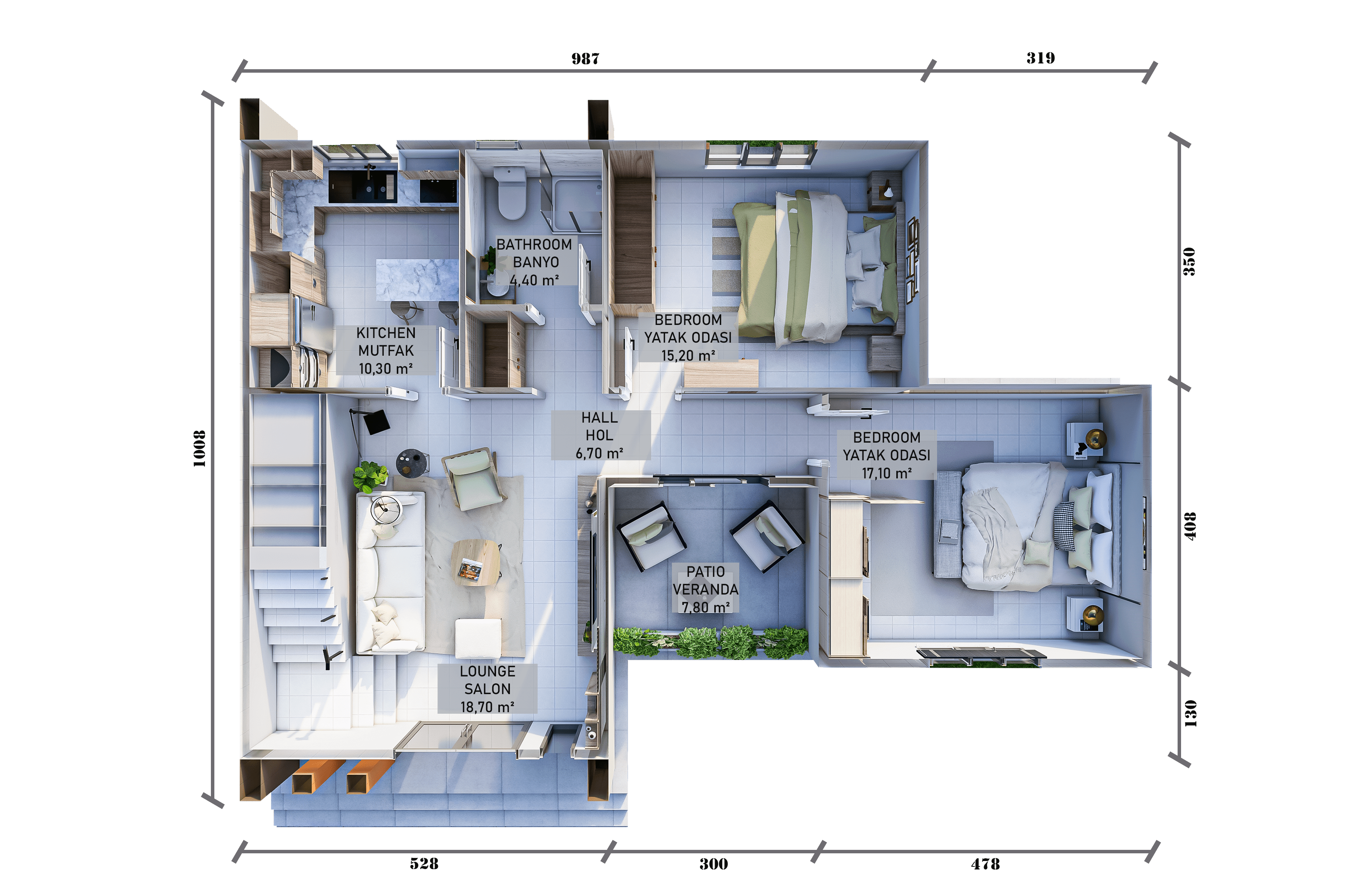 Alt katta yer alan salon ve mutfak alanı, günlük yaşamın merkezini oluşturur. Açık ve ferah plan, alanın verimli kullanılmasını sağlarken verandayla kurulan ilişki iç ve dış mekân geçişini güçlendirir. Bu kat, misafir ağırlama ve ailece vakit geçirme için ideal bir kullanım sunar.