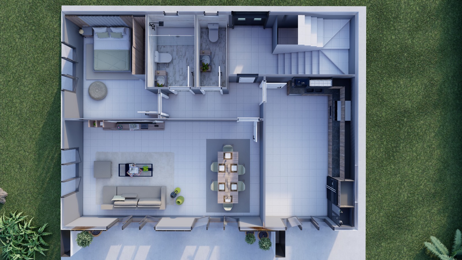 Alt katta yer alan salon ve mutfak alanı, ailenin bir arada vakit geçirdiği ana yaşam alanını oluşturur. Geniş hacimli plan sayesinde ferah bir atmosfer sunarken, dış mekânla kurulan ilişki günlük yaşamı daha keyifli hale getirir. Alt kattaki banyo, misafir kullanımı açısından önemli bir avantaj sağlar.