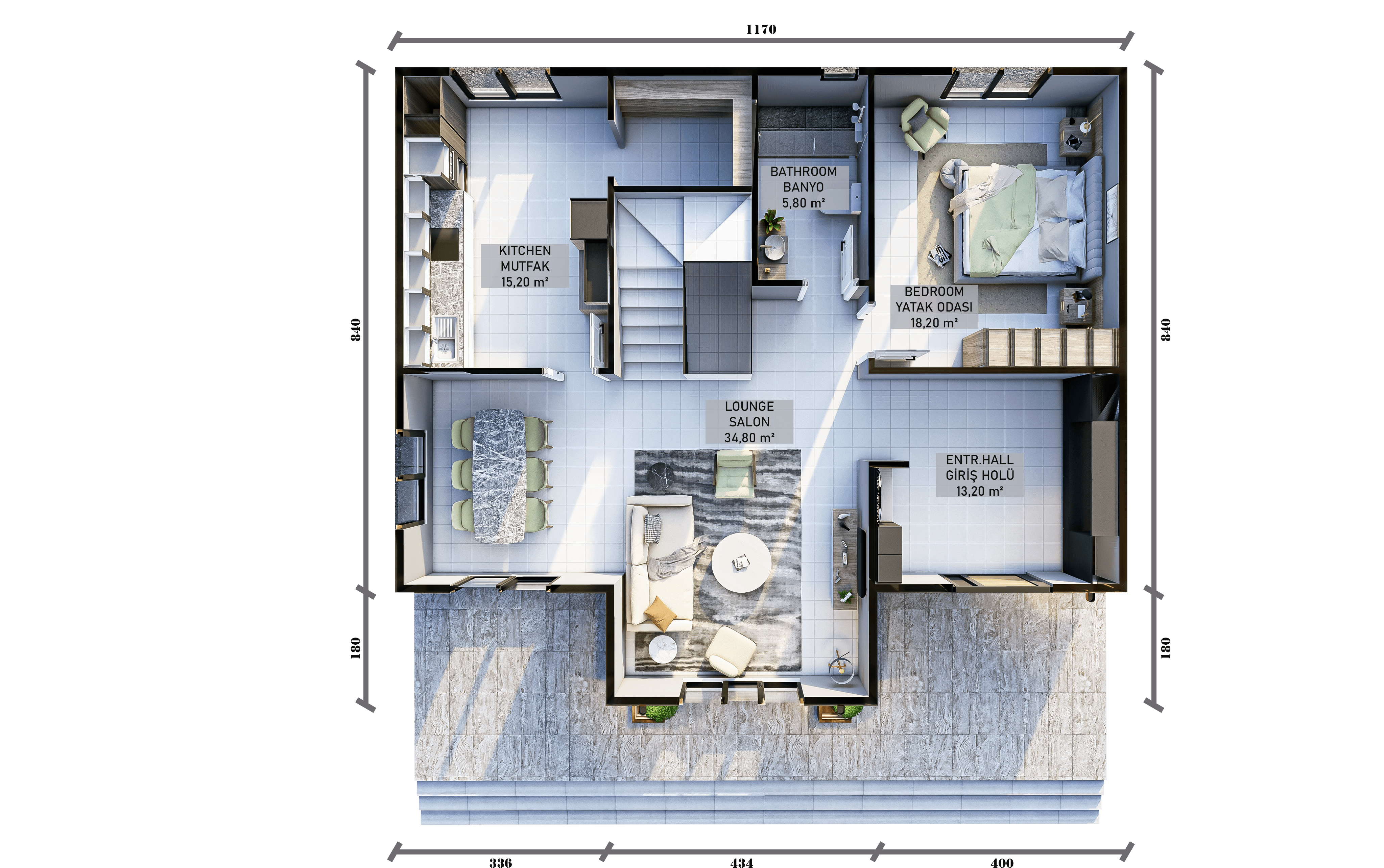 İki katlı plan: Sosyal ve özel alanlar net ayrılır