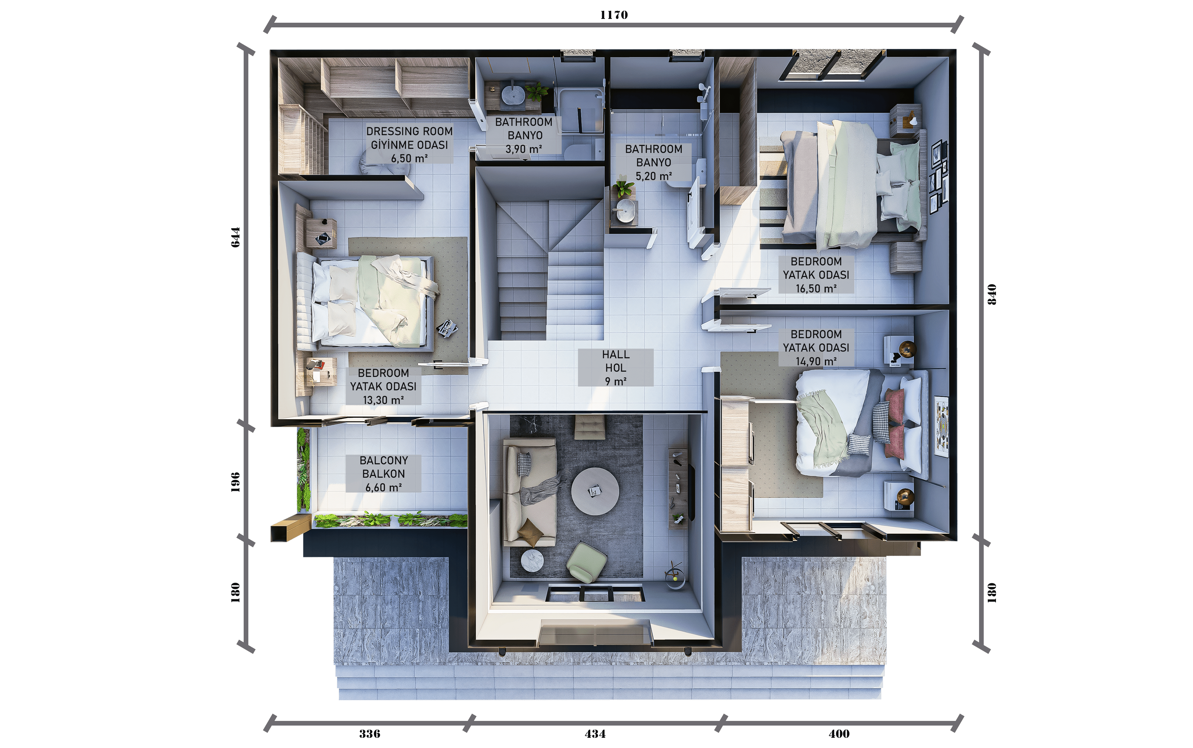 Üst katta konumlanan 3 yatak odası, aile bireylerine özel ve sakin alanlar oluşturur. Birden fazla banyonun bulunması, özellikle kalabalık ailelerde günlük yaşamı ciddi şekilde kolaylaştırır. Odaların gün ışığı alacak şekilde konumlandırılması, ferahlık hissini güçlendirir.