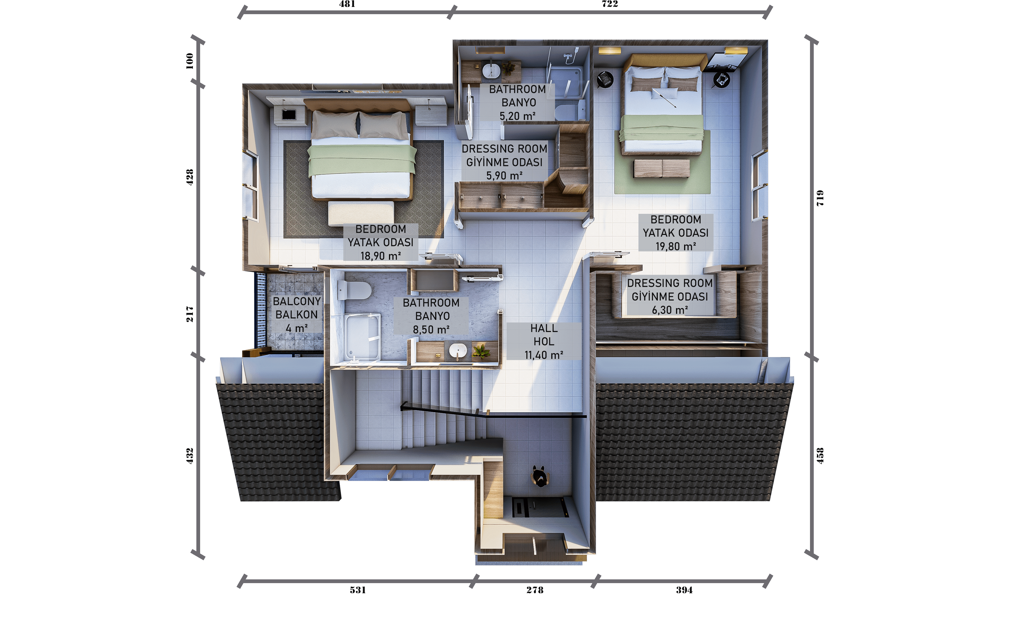 Üst katta konumlanan 3 yatak odası, sakin ve özel yaşam alanları sunacak şekilde planlanmıştır. Toplamda 3 banyoya sahip olması, bu modeli hem aile yaşamı hem de uzun süreli konfor açısından güçlü kılar. Odaların ölçüleri ve yerleşimi, ferahlık hissini destekler.