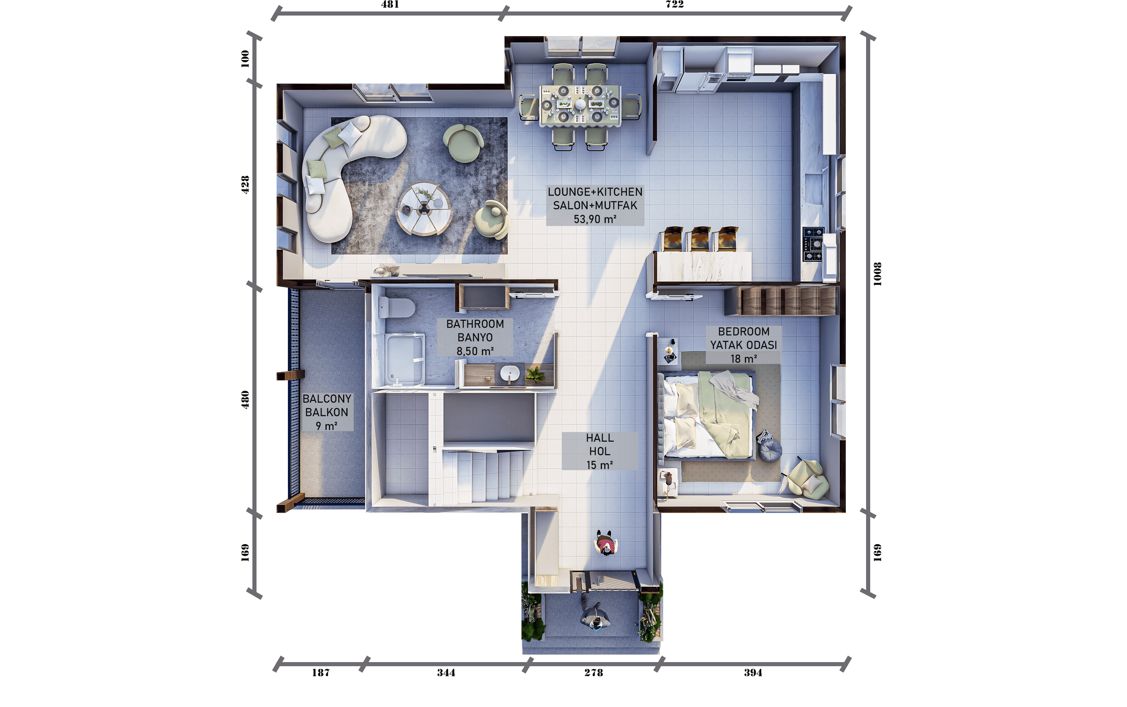 Alt katta yer alan geniş salon ve mutfak alanı, açık ve ferah planıyla günlük yaşamın merkezini oluşturur. Sosyal alanların rahat kullanımı, hem aile yaşamını hem de misafir ağırlamayı konforlu hale getirir. Alt kattaki banyo, günlük kullanımda önemli bir pratiklik sağlar.