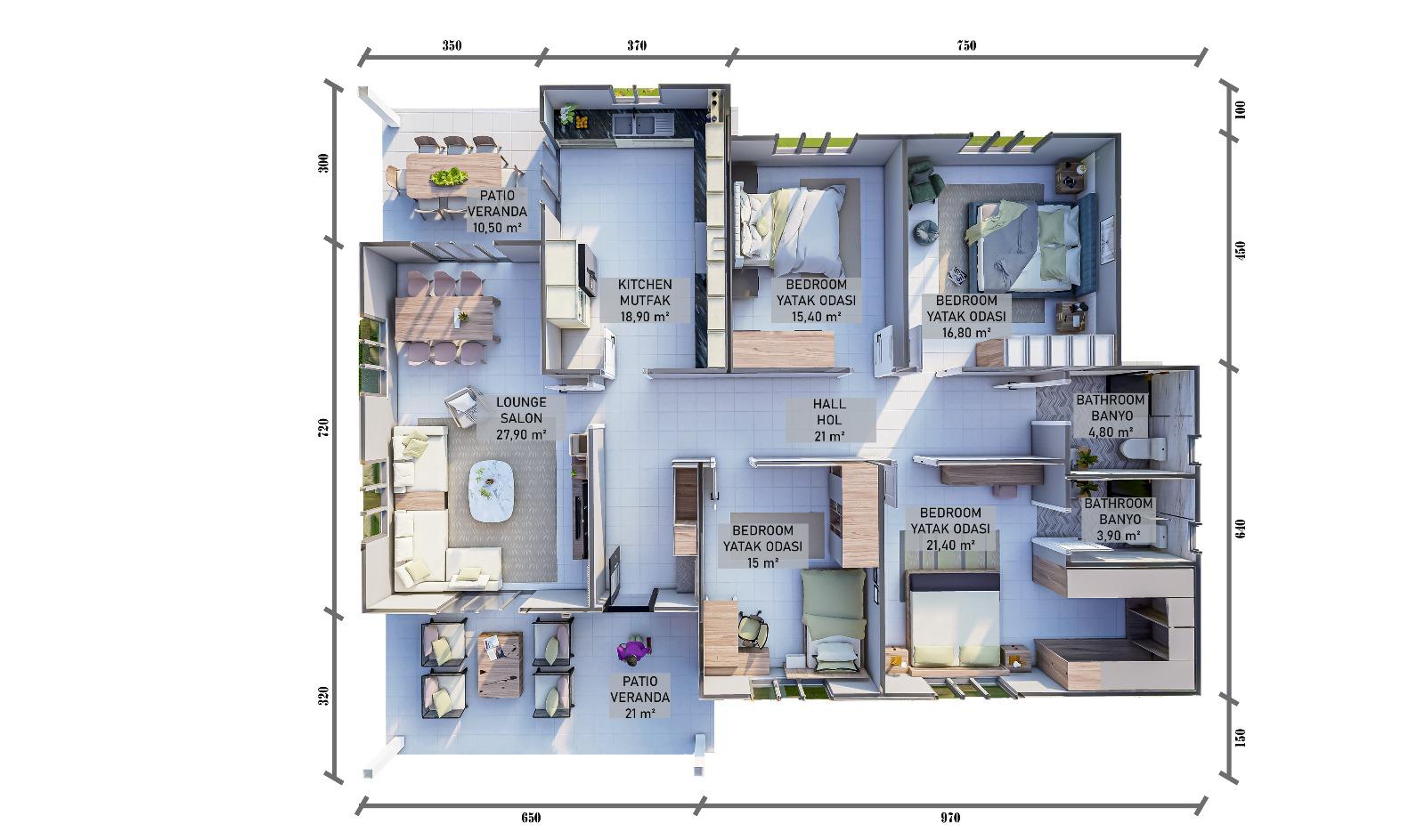 Birden fazla yatak odasıyla şekillenen plan şeması, aile bireylerinin hem birlikte vakit geçirebileceği hem de kendi özel alanlarını koruyabileceği dengeli bir yerleşim sağlar. Odaların metrekareleri, yalnızca uyku alanı değil; çalışma, dinlenme ve depolama ihtiyaçlarını da karşılayacak şekilde tasarlanmıştır. Banyoların dağılımı ise günlük kullanımda pratiklik ve mahremiyet avantajı sunar.